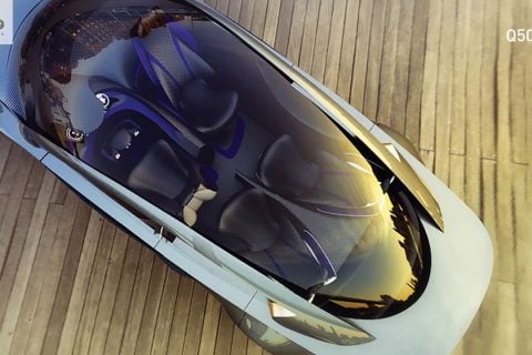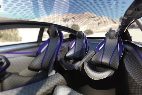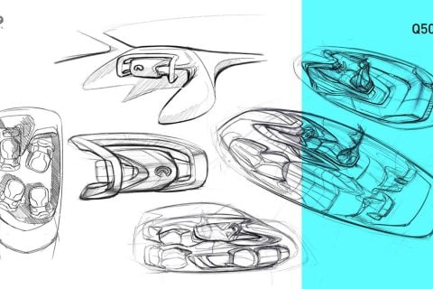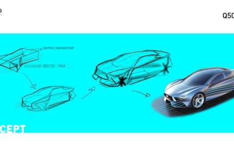 Kannan’s envisioned Q50 EV emphasises the electric drivetrain while avoiding the stereotypes of EVs, which results in relatively clean surfacing and bold architecture that quietly hint of the powertrain while remaining driver focused.