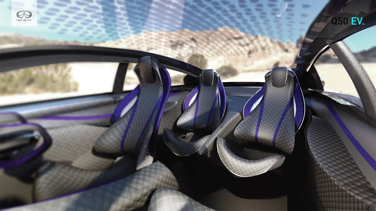 The Q50 EV looks similar to the current Q50, which evokes the feeling of waves and motion but with a more driver-oriented design, giving a maximum sense of control over the vehicle. A seating configuration of 1+3 was employed; the front passenger seat faces the rear seat passengers to create a sense of togetherness among the passengers while providing a lounge-like environment for the passengers.